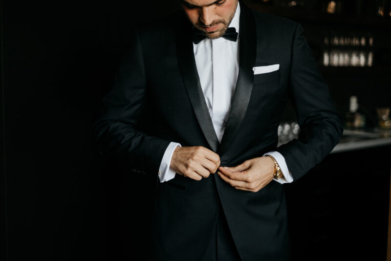 Fittings is crucial for men’s wedding suits, regardless of whether the suit is off-the-rack or custom-made. They ensure the suit is comfortable and flattering from every angle. It’s common to have at least two to three fittings: the initial fitting, a secondary fitting for adjustments, and a final fitting to confirm everything is impeccable. Grooms should also consider the season and potential weight fluctuations when planning fittings to ensure the best fit on the wedding day.